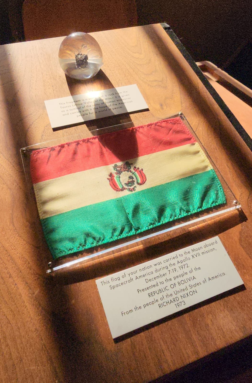 En diciembre de 1972, la misión Apolo 17 llevó banderas de distintos países hasta la Luna. A su retorno, la NASA entregó a cada nación su bandera y un pequeño fragmento de suelo lunar, como recuerdo de ese hito. En Bolivia, este recuerdo llegó en 1973 y fueron recibidos por el entonces presidente Hugo Banzer, quien dispuso su entrega a la UMSA, institución que desde entonces los conserva como parte de su patrimonio científico.